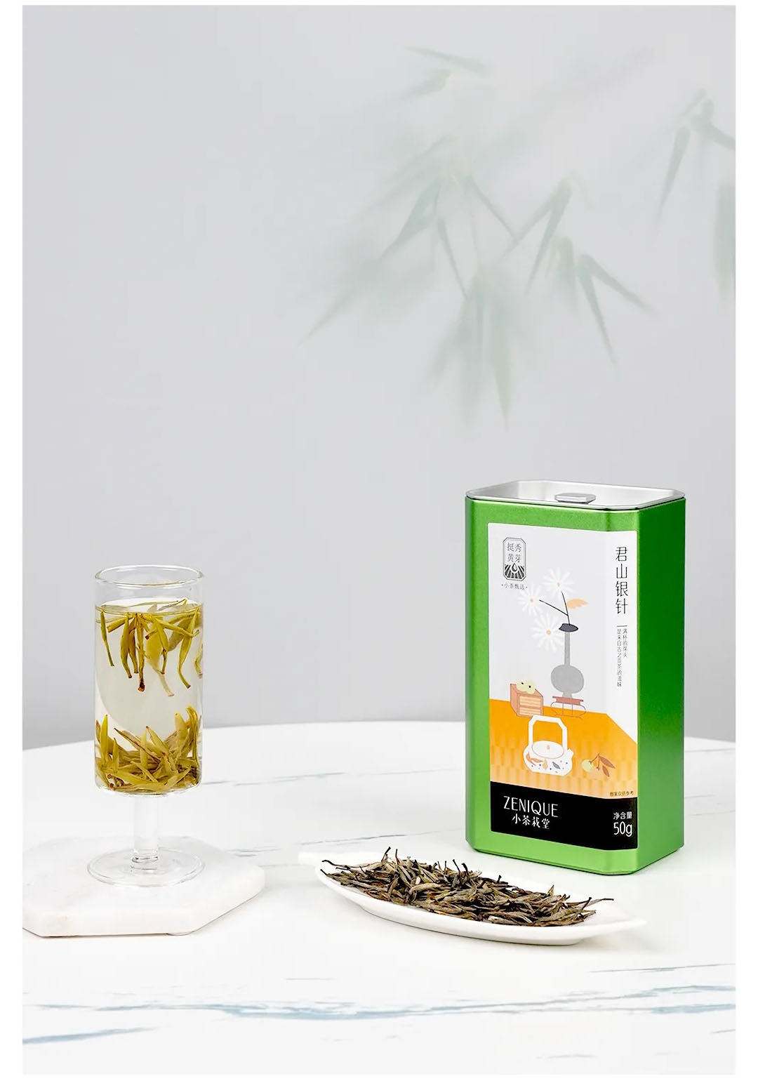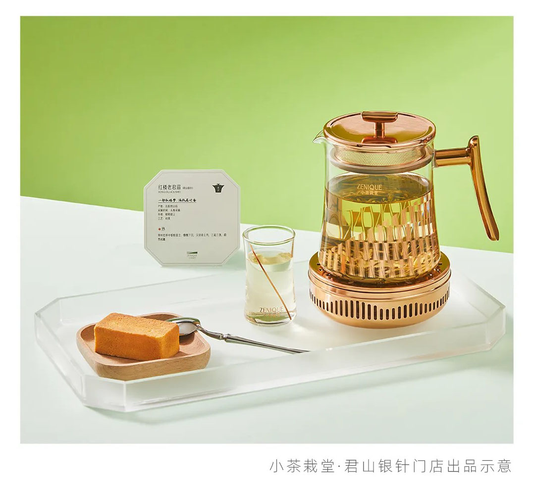 小茶栽堂·君山银针:产于洞庭湖君山岛,其干茶芽头呈金黄色,形似银针,匀齐且完整;冲泡时芽头舒展,如一根根银针立在水中,徐徐下沉再慢慢上升赏心悦目。茶汤茶毫丰盈,爽滑清甜,饮之犹如泛舟洞庭八百里风涛;